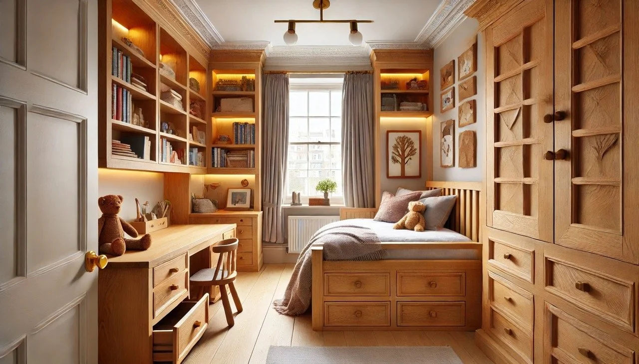Here is a visual concept of a London child's bedroom designed by Mariusz Ossowski, a master carpenter. The bespoke wooden elements and thoughtful layout make it a functional and inviting space for a child.
